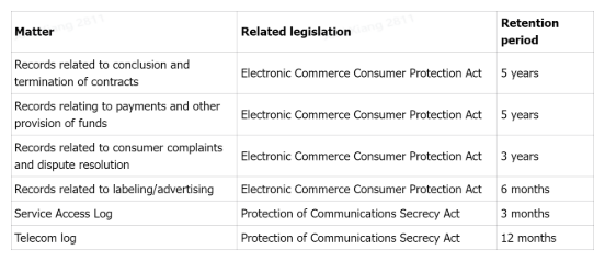 The mandatory retention periods for personal information stipulated by Korean law are as follows: